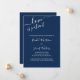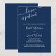 Cartão de anúncio de adiamento de casamento com paleta de cores azul naval e branco minimalista. "O amor é paciente", junto com os nomes da noiva e do noivo, é escrito à mão em letra cursiva elegante. O modelo está configurado para você personalizar a mensagem de atualização do seu casamento. A redação da amostra lê "devido a eventos recentes, o casamento de [seus nomes] foi adiado. Vamos informar assim que definirmos uma nova data. Foi uma decisão difícil e agradecemos a sua compreensão" - que você pode manter ou editar como desejar.