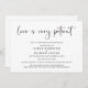 Anúncio minimalista moderno em preto e branco de adiamento de casamento e mudança de planos. "o amor é muito paciente" é escrito em uma fonte elegante e sofisticada e você pode personalizar facilmente se a data do casamento foi adiada ou se quaisquer outros detalhes foram alterados.