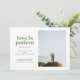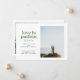 Se você tomou a decisão de fugir em vez de esperar por uma data de casamento adiada, compartilhe a grande notícia com este cartão de anúncio de fuga. Ele apresenta texto em verde musgo e cinza escuro e espaço para uma única foto vertical na frente, bem como espaço para a data e local da fuga. O verso do cartão tem espaço para outra foto e uma nota pessoal.