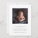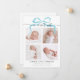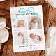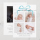 Whimsical e mínimo anúncio de nascimento Cartão de Natal com texto de roteiro que diz "nosso presente perfeito" no topo com 4 fotos na frente. Há uma ilustração de um arco no topo.