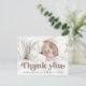 Branco ou qualquer obrigado de cor que você anotar com o anúncio de nascimento com o texto "obrigado você" em uma fonte de estilo retroativo sobre sua foto, e sua mensagem personalizada no verso. Você pode alterar todas as cores, mover e redimensionar elementos com a ferramenta design.