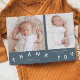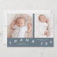 Cartão de nascimento branco com texto tipográfico que diz "obrigado você" na parte inferior com duas fotos na fonte. Você pode adicionar uma terceira imagem no verso juntamente com as estatísticas de natalidade e a mensagem. o fundo é azul ardente.
