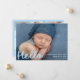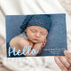 Seja bem-vinda a sua pequena com este doce e moderno anúncio de nascimento de fotos com a fotografia horizontal do seu bebê e a palavra "Olá" num guião manuscrito azul-céu alegre. Personalize a frente com o nome do seu bebê, data de nascimento e estatísticas de natalidade para uma introdução sentida. As costas incluem uma colagem de seis fotos quadradas com espaço abaixo para compartilhar os nomes de sua família — uma escolha encantadora e na moda, perfeita para celebrar meninos.