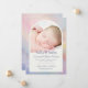 Nosso anúncio de nascimento pastel bonito para uma bebê recém-nascida apresenta uma foto em forma de na moda na frente e uma colagem de três fotos na parte de trás. Esta design brilhante, feminina e funcional inclui um belo coração e um doce texto dizendo "olá, querido". Personalize com o nome do seu bebê e as estatísticas de natalidade para criar um anúncio clássico e bonito. O esquema de cor púrpura, azul e rosa pastel torna isso perfeito para sua nova princesa. Este anúncio é perfeito para compartilhar sua alegria de uma forma bonita.