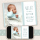 Olá, cartão de anúncio de nascimento de fotografia para o seu novo bebê. Design simples e elegante com tipografia de fontes finas e magras e uma paleta de cores suave de dois tons azul e branco. O modelo de foto está configurado para que você adicione sua foto favorita e você também pode adicionar sua própria mensagem de anúncio de nascimento personalizada com estatísticas de natalidade no verso. O texto na frente diz "olá, meu nome é [nome do bebê] e mal posso esperar para conhecê-lo!". Por favor, procure mais designs na minha loja.