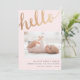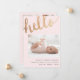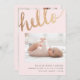 Cartão de modelo de anúncio de nascimento elegante e moderno, com 4 fotos de sua escolha (frente e verso) com um roteiro manuscrito em ouro falso que diz "olá" no topo contra um fundo rosa. Personalize este produto adicionando o estado de nascimento do seu filho na parte inferior. Perfeito por anunciar o nascimento da sua menina!
