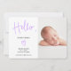 Um guião moderno, simples e elegante saudação tipografia, anúncio de nascimento de uma menina com uma colagem fotográfica, e uma elegante caligrafia tipográfica, com um nome de bebê. Apresentando o bebê! A cor roxa é totalmente editável.