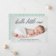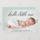 Anuncie seu novo bebê aos amigos e à família com este adorável anúncio de nascimento de uma foto. O anúncio de nascimento de na moda apresenta "alô pequeno" em uma fonte bonito de script, espaços reservados para o seu texto e foto personalizados e um padrão de bolinhas verde e preto da casa da moeda no verso do cartão.
