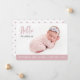 Cartão de nascimento simples e moderno com um modelo fotográfico com um texto sobreposto em fontes antigas de cor rosa e cinza escura que lê Olá, sou Amelia (personalizável com o nome do seu bebê). A velha banda rosa na parte inferior é personalizável com as estatísticas de natalidade em letras brancas. A parte de trás da carta apresenta um padrão cardíaco rosa elegante e antigo.