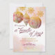Cartão de aviso de gravidez fotográfica para o feriado. O anúncio diz: "Estamos esperando um monte de alegria" em tipografia decorativa e o modelo está pronto para você adicionar sua foto (no verso), nome e data de vencimento do bebê, assim como seu sinal e nomes. O design apresenta Enfeites de natal e flocos de neve sobredimensionados em ouro e um tipo de olhar iridescente sobre um fundo de aquarela nebulosa.