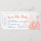 Bilhete de embarque náutico de passagem de casamento, exceto o cartão de aviso de data com picos finos de coral seco do oceano rústico e tipografia elegante, mostrados em coral cor-de-rosa laranja e azul-marinho. Todas as cores e fontes podem ser alteradas no editor de modelo.