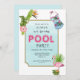 Convites de festas de Piscinas Tropicais Cutas, com piscinas de aquarela e folhagem tropical com folhas de palma e hibisco, maiô e flamingo perfeitos para o Aniversário, Graduação ou qualquer outra festa de piscina de Verão