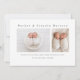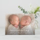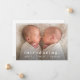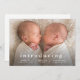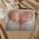 Um anúncio simples e mínimo de nascimento de fotos gêmeas com o tipo moderno e uma grande foto horizontal na frente. O verso tem 2 fotos com cabeçalho de nome grande e mensagem pessoal da família. Clique no botão editar para personalizar este design com suas fotos e detalhes.