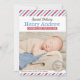 Anuncie o seu bebê em estilo com estes cartões de nascimento de fotos inspirados no vintage que apresentam um tema especial de entrega de correio aéreo, vermelho clássico, fronteira diagonal branca e azul listrada e design de carimbo redondo de cinza de carvão.