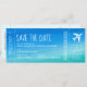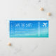 Um bilhete casual de avião de embarque de avião de praia no destino do casamento, salve o cartão com uma turquesa ombre e um plano de gradação de aquarela azul. As cores do avião e do texto são todas editáveis no designer avançado.