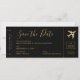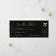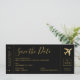 Cartão de Passagem de Embarque Salve a Data do Avião em Black and Faux Gold Foil com um elegante design moderno minimalista que apresenta o nosso diverso e único avião com um motor central de coração, mostrado em preto e ouro, mas todo texto, linhas e cores de fundo são editáveis para que você possa criar seu próprio design usando este modelo para um moderno passe de embarque que foi projetado com um casamento de destino ou viagem ou aniversário mente. Visite a coleção do designer Destinos de Fita de Papel para coordenar itens.