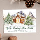 Anúncios elegantes, em movimento, com uma cabana de madeira rústica, coberta de neve, cercada por montanhas e pinheiros. "Estamos Decking New Halls" é exibido em um roteiro verde-escuro com seu endereço mostrado abaixo. O anúncio em movimento da cabine de registro reverte para um fundo verde escuro nevado.