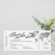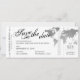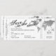 Cartões de Passagem de Embarque Salve a Data do Avião Cartões de Bilhete em um elegante design moderno com um mapa de prata no mundo design em preto e branco e cinza. Todas as cores de texto e fundo são editáveis para que você possa criar seu próprio design usando este modelo para um cartão de embarque único que foi projetado com um casamento de destino ou um casamento do tema viagem ou uma celebração de renovação de votos em mente. Visite a coleção de designer do Custom Paper Works para coordenar itens.