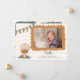 Adorável anúncio de nascimento de uma foto de bebê com uma ilustração de um pequeno pato e uma terra em cores neutras em relação ao gênero. Ilustrada e projetada por Patricia Alvarez. Fotografia © Storytree Studios, Stanford, CA