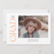 Este anúncio de graduação em na moda apresenta a palavra formando em uma serifa de tendências de pêssego ao longo do lado esquerdo. A frente tem espaço para uma foto do formando assim como seu nome, ano de aula e escola. O verso do anúncio tem espaço para uma segunda foto e uma pequena mensagem.