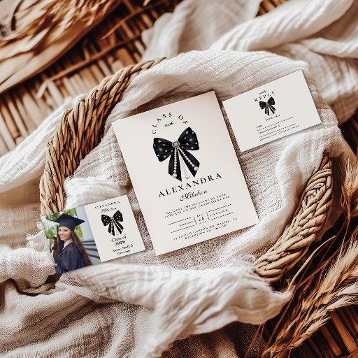 Celebrate her milestone in true coquette style with this elegant pearl-and-champagne graduation design. A soft blush backdrop, delicate bow details, and a shimmering coupe glass create a refined, feminine look that feels both celebratory and timeless. Personalize the text to feature your graduate’s name, event details, and reception information. A perfect choice for a sophisticated graduation gathering with a touch of vintage charm.