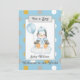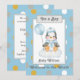 Celebre a chegada de seu garotinho com esse cartão de anúncio do bebê Pinguim. O cartão apresenta um pinguim de desenho animado bebê segurando um balão azul e sentado numa nuvem com um fundo bolinhas de branco azul e cinzas / cinzas. O cartão pode ser personalizado com seu próprio anúncio e personalizado com seus próprios detalhes do bebê. O verso do cartão anuncia o nascimento ou seu filho com seu nome, data de nascimento e peso, e adiciona seus próprios nomes no final. Todos os textos podem ser alterados em função das nossas necessidades. Oh e parabéns.