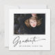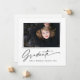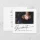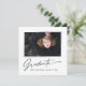 Cartões modernos e elegantes de anúncio de graduação desenhados em quadrado, com elementos de texto moderno com script de tinta de caligrafia. A foto do formando na frente da placa é realçada com uma delicada e minimalista placa de gradiente. A parte traseira do cartão oferece espaços de texto personalizados para informações sobre a sua graduação ou pode ser apagada se você quiser enviar uma mensagem. Preto e branco ou personalize facilmente o fundo para corresponder à cor primária da sua escola ou a qualquer cor da sua escolha. Perfeito para o segundo grau, universitário e estudante de formando universitário.