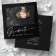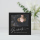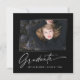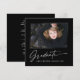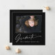 Cartões modernos e elegantes de anúncio de graduação, projetados por quadrado, com elementos do texto moderno com script de tinta de caligrafia em branco para opções de cores de fundo mais escuras. A foto do formando na frente da placa é realçada com uma delicada e minimalista placa de gradiente. A parte traseira do cartão oferece espaços de texto personalizados para informações sobre sua graduação. Preto e branco ou personalize facilmente o fundo para corresponder à cor primária da sua escola ou a qualquer cor da sua escolha. Perfeito para o segundo grau, universitário e estudante de formando universitário.