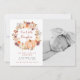Um bonito cartão de anúncio de nascimento para a sua chegada ao outono, com uma coroa floral com uma abóbora a aquarela com flores roxas, terracotta e pêssego. Dentro é um título editável "nossa abóbora". Ao lado está sua foto favorita do seu pequeno.