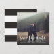 Anúncio de save the date caprichoso e elegante com foto com caligrafia moderna branca e fundo com padrão de listras
