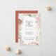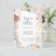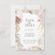 Flores e fuselagem secadas biologicamente e elegantes, Salve o Cartão de Encontro. O quadro apresenta frentes secas de palma, rosas, orquídeas e erva-pampas numa paleta de cores neutra. A parte traseira da placa é mostrada em cor laranja queimada sólida.