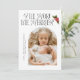 Cartão de nascimento de Natal elegante, com texto tipográfico misturado de roteiro e fontes serif, que diz "quanto mais melhor" com uma ilustração aquarela de bagas vermelhas. A moldura da foto é em forma de arco. Este é um cartão de anúncio de nascimento para as férias! Adicione suas fotos, estatísticas de natalidade e uma mensagem! A foto vertical funciona melhor na frente.