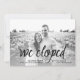 Este anúncio de casamento elegante e simples "nós fugimos" mostra sua foto de sangria de cheio, com uma camada de caligrafia negra e moderna. Há a opção de adicionar uma mensagem à parte traseira do cartão, se desejar.