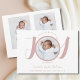 Apresente sua linda menina recém-nascida com este anúncio de nascimento moderno. A frente apresenta a palavra alegria na tipografia da escrita rosa-na moda e a fotografia, o nome do cheio, a data de chegada e as estatísticas de natalidade do seu recém-nascido. Na parte traseira do cartão, você pode adicionar duas fotos adicionais.