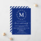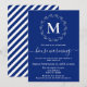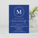 Elegante fundo azul real com uma delicada coroa botânica branca e monograma com tipografia branca para detalhes de convite para aquecimento da casa. Linhas brancas diagonais personalizáveis e azuis reais na parte de trás para uma aparência pré-disquete moderna.