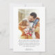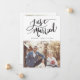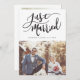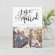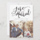 Um cartão de modelo de anúncio de casamento moderno com um texto de tipografia escrito à mão que diz "Recem casados" com seu nome e data de casamento. Personalize este produto adicionando duas imagens. Uma das fotos vai na parte de trás do cartão com seu casamento e obrigado sua mensagem.