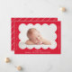 Anúncio de nascimento simples e moderno com a foto do seu bebê aninhada dentro de uma brilhante estrutura vermelha escalpada. Personalize o anúncio de nascimento vermelho adicionando o nome do seu bebê e informações adicionais em letras brancas. A parte traseira da placa apresenta um design de stripe mínimo vermelho e branco.