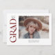 Este anúncio de graduação em na moda apresenta a palavra formando em uma serifa vermelha escura ao longo do lado esquerdo. A frente tem espaço para uma foto do formando assim como seu nome, ano de aula e escola. O verso do anúncio tem espaço para uma segunda foto e uma pequena mensagem.