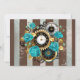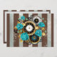 Relógio antigo e patenteado, adornado com joias, mãos de ouro e algarismos latinos com rosa de turquesa sobre fundo castanho e listrado. Estilo Steampunk.
