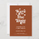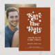 Modern Retro Typography Photo Wedding Announcement Flat Card. With a modern retro typography "save the date" over a terracotta brown background on the front, with names and date in a simple and minimal design, add your wedding website for event details. On the back is a full-frame photo of the couple. A unique and affordable Wedding Save the Date for couples on a budget. Choose prints and/or a digital announcement download.