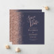 A borda esquerda deste elegante casamento moderno salve o cartão de data apresenta um rosa dourado falso borda brilhante. O texto personalizável combina a letra rosa-rosa, a letra copperplate e a letra itálico num fundo azul escuro. O verso apresenta um design azul escuro e rosa dourado correspondente.