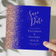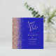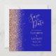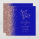 A borda esquerda deste elegante casamento moderno salve o cartão de data apresenta um rosa dourado falso borda brilhante. O texto personalizável combina manuscrito pálido de cor azul-pincelada, manuscrito e fontes itálicas em um fundo azul real. O verso apresenta um design real azul e rosa dourado correspondente.
