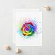 Rosa grande e florescente com pétalas arco-íris sobre fundo branco, pintadas com pedaços de tinta colorida e brilhante. 3d