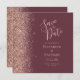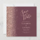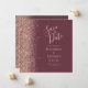 A borda esquerda deste elegante casamento moderno salve o cartão de data apresenta um rosa dourado falso borda brilhante. O texto personalizável combina manuscrito colorido cor branco de rosa pálido, manuscrito e fontes itálicas em um fundo burlando escuro. O lado inverso apresenta uma burgundy e uma design de ouro rosa.