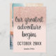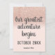 Nossa maior aventura começa... Anuncie sua gravidez com este moderno e elegante ombre rosa dourado brilhante em cor-de-rosa pastel editável com uma caligrafia moderna. Adicione sua foto atrás. O bebê está vindo!
