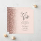 A borda esquerda deste elegante casamento moderno salve o cartão de data apresenta um rosa dourado falso borda brilhante. O texto personalizável combina a escrita manual de cinzas de carvão, fontes em copperplate e itálico em um fundo cor-de-rosa pincelado. O verso apresenta um design cor-de-rosa-pincel e rosa dourado correspondente.