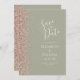 A borda esquerda deste elegante casamento moderno salve o cartão de data apresenta um rosa dourado falso borda brilhante. O texto personalizável combina manuscrito de marfim, fontes em copperplate e itálico em um fundo verde de sábio. O verso apresenta um design verde-sábio e rosa dourado correspondente.