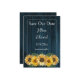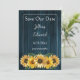 Personalize um anúncio de casamento único com um Rustic Blue Sunflower Save the Date. Design de lançamento apresenta um fundo de madeira rústico com um buquê elegante de girassóis. Salve ainda o anúncio de data disponível para este design em várias cores.