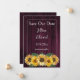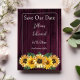 Personalize um anúncio de casamento único com um Rústico Girassol Magenta Salve a Data. Design de lançamento apresenta um fundo de madeira rústico com um buquê elegante de girassóis. Salve ainda o anúncio de data disponível para este design em várias cores.