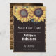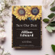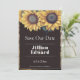 Personalize um anúncio de casamento único com um Girassol Russo Salve a Data. O design de lançamento apresenta um trio de girassóis de aquarela contra fundo rústico de madeira. Salve ainda o anúncio de data disponível para este design em várias cores.